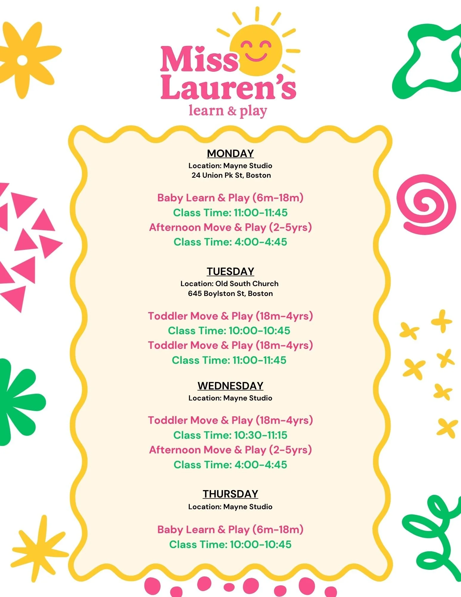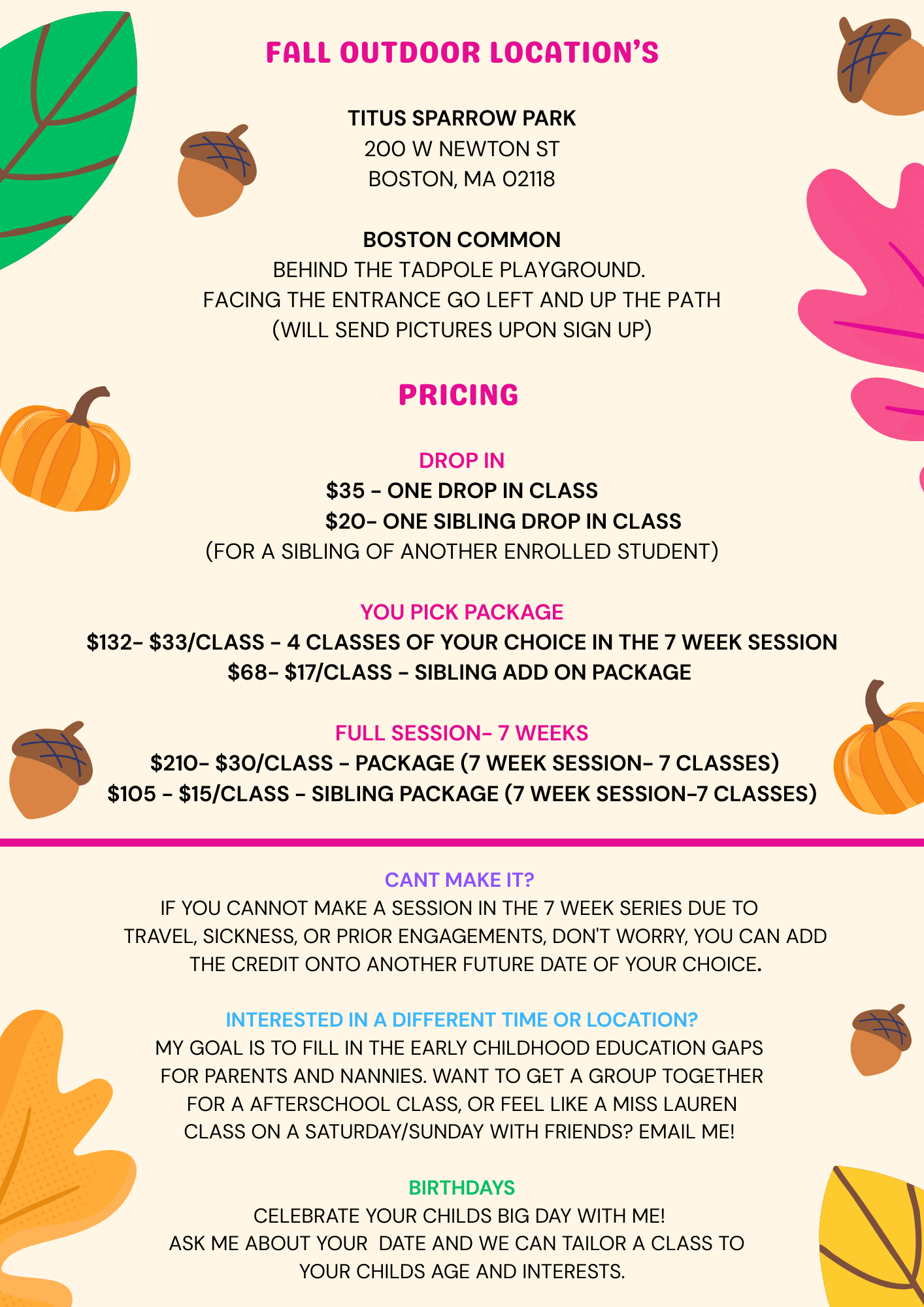 Miss Lauren’s goal is to fill in the early childhood education class gaps for parents and nannies. Want to get a group together for a afterschool class, or feel like a class on a weekend with friends? send a message.