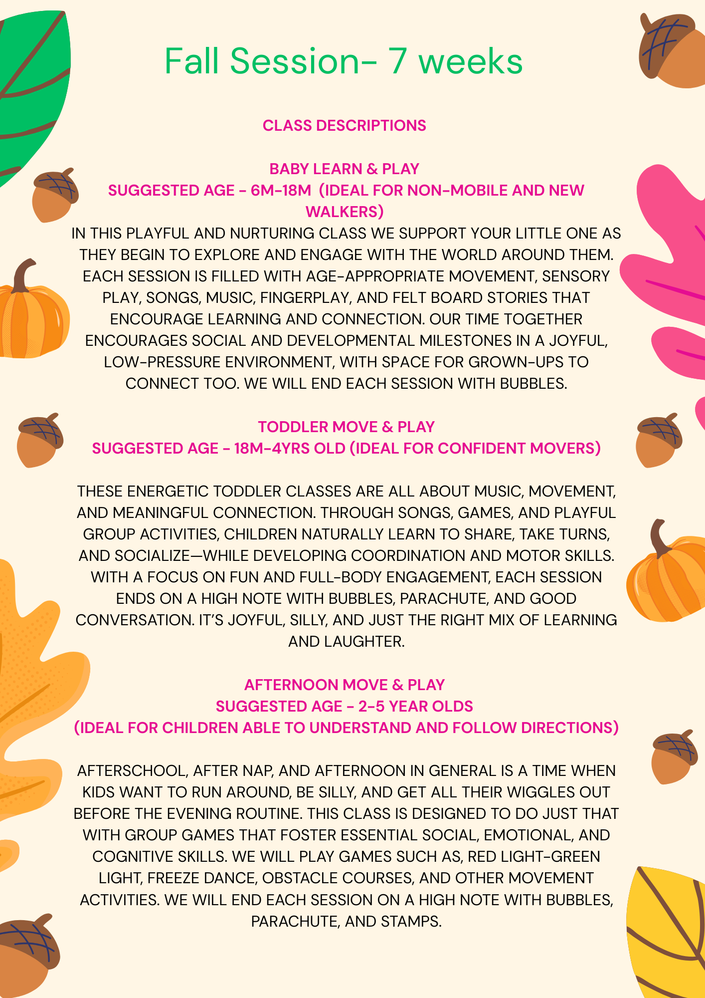 Enroll in our weekly classes where your little one can build routine, form friendships with a familiar group, and thrive in a joyful, consistent environment designed just for them.